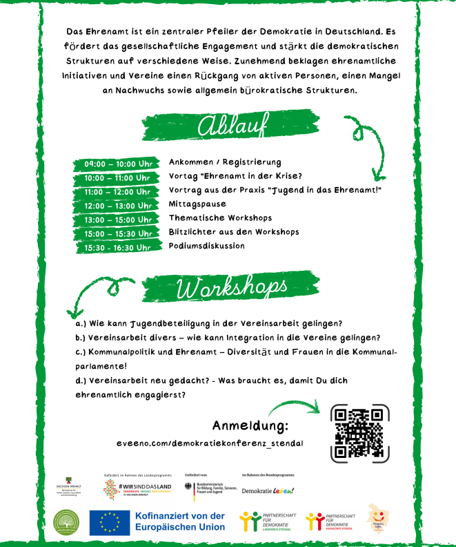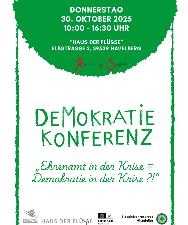 Am Do. 30.10.2025, von 09:00 Uhr – 16:30 Uhr laden die Demokratiepartnerschaften der Hansestadt Stendal & des Landkreises Stendal sowie das Projekt „Rettet die Dorfkümmerer in das Haus der Flüsse nach Havelberg , um unter dem Titel „Ehrenamt in der Krise = Demokratie in der Krise?!„ mit Akteuren aus der Zivilgesellschaft, der (Kommunal-)Politik sowie der Wirtschaft im Rahmen von Vorträgen, Workshops und einer Podiumsdiskussion über ehrenamtliche Strukturen in der Altmark ins Gespräch zu kommen.