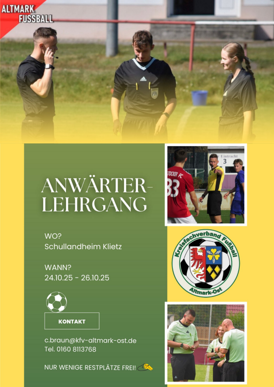 Stendal (kf). Der nächste Schiedsrichteranwärterlehrgang steht bevor. Vom 24. bis 26. Oktober freut sich der Schiedsrichterausschuss wieder darauf, Interessierte zu Schiedsrichtern auszubilden. Der Lehrgang findet wie gewohnt im Schullandheim in Klietz statt. Von Freitagabend bis Sonntagmittag werden die Anwärter vom Schiedsrichterlehrwart Christian Braun und seinem Team in den 17 Fußballregeln geschult. Dies geschieht sowohl in der Theorie, in der die Regeln mithilfe von PowerPoint-Präsentationen vermittelt werden, als auch in praktischen Einheiten, in denen Fahnenzeichen, der Umgang mit der Pfeife und das Stellungsspiel auf dem Rasen geschult werden.