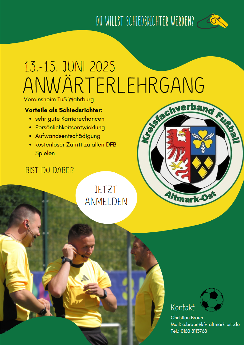 Anmeldungen oder auch unverbindliche Anfragen zu dieser Thematik können jederzeit an Lehrwart Christian Braun (Tel.: 0160/8113768m Mail: c.braun@kfv-altmark-ost) oder die Mitglieder des Schiedsrichterausschusses gerichtet werden.